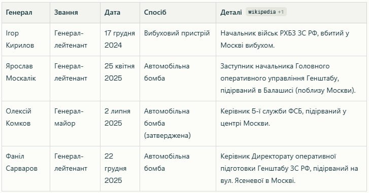 "За 2024–2025 роки всі відомі успішні ліквідації російських генералів і високопосадовців силового блоку в московському регіоні мали спільну характерну ознаку — застосування вибухових пристроїв", — наголошують аналітики.