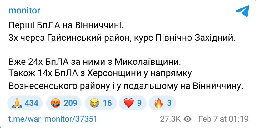 Значна частина "Шахедів" взяла західний курс у напрямку Вінницької області. Близько 01:20 години у небі над регіоном військові зафіксували входження перших ударних дронів, monitor попередив про рух кількох ще кількох десятків БпЛА курсом на Вінниччину.