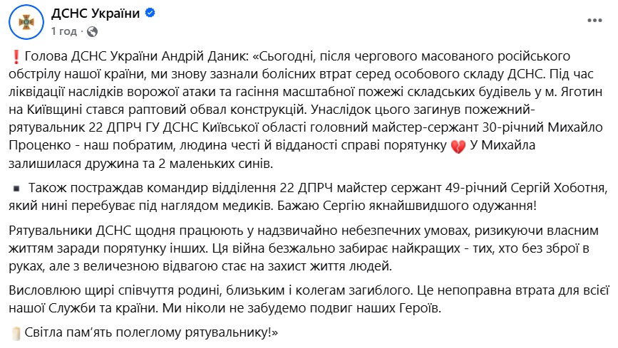 30-річний головний майстер-сержант служби цивільного захисту Державної служби з надзвичайних ситуацій Михайло Проценко загинув під час ліквідації наслідків після атаки ЗС РФ 7 лютого по складських будівлях у Яготині Київської області.