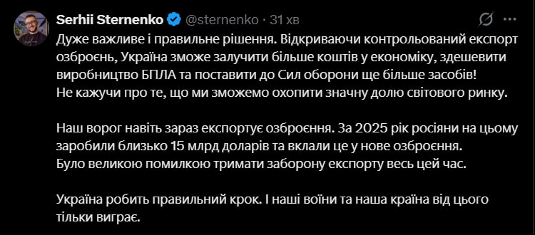"Не кажучи про те, що ми зможемо охопити значну долю світового ринку. Наш ворог навіть зараз експортує озброєння. За 2025 рік росіяни на цьому заробили близько 15 млрд доларів та вклали це у нове озброєння. Було великою помилкою тримати заборону експорту весь цей час. Україна робить правильний крок. І наші воїни та наша країна від цього тільки виграє", — пояснив Стерненко.