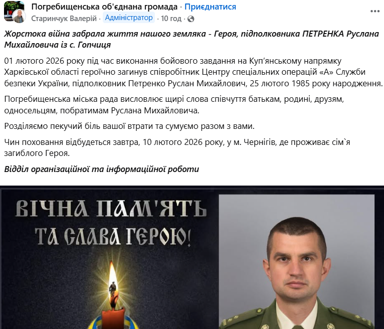 "1 лютого 2026 року під час виконання бойового завдання на Куп’янському напрямку Харківської області героїчно загинув співробітник Центру спеціальних операцій "А" Служби безпеки України, підполковник Петренко Руслан Михайлович, 25 лютого 1985 року народження", — йдеться у повідомлегні.