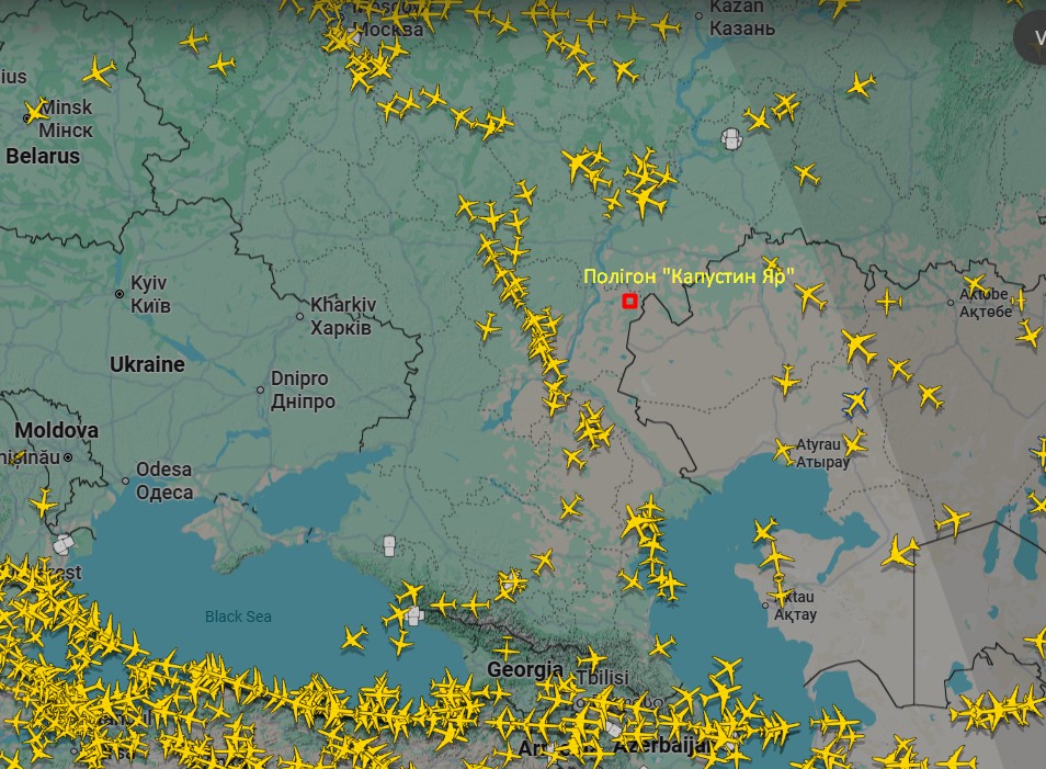 Інформації про закриття повітряного простору вдень 12 лютого не відшукалось. Втім, моніторинговий сервіс Fflightradar24 показав, що території навколо полігону "Капустин Яр" літаки облітають вже сьогодні. При цьому таймлайн за минулі періоди показав, що 12-24 години тому повітряні судна пролітали над цією територією.