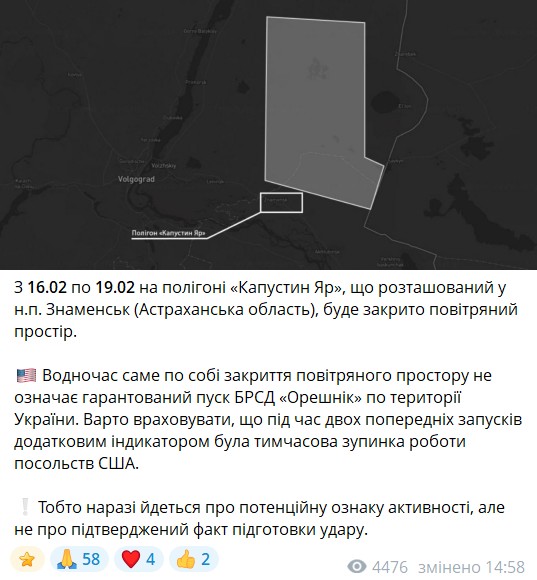 Ракета Орешник — попередження про закриття полігону "Капустин Яр" до 19 лютого