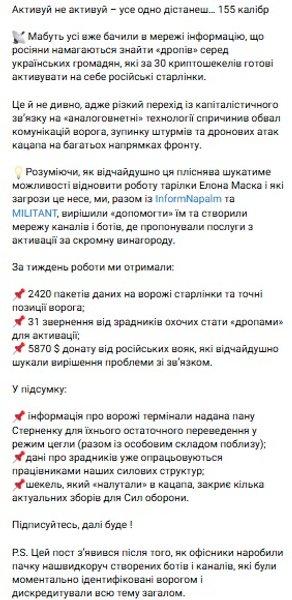 "Розуміючи, як відчайдушно ця пліснява буде шукати можливості відновити роботу тарілки Ілона Маска і які загрози це несе, ми, разом з InformNapalm і MILITANT, вирішили "допомогти і посприяти" активації за скромну винагороду", — пишуть хакактивісти.