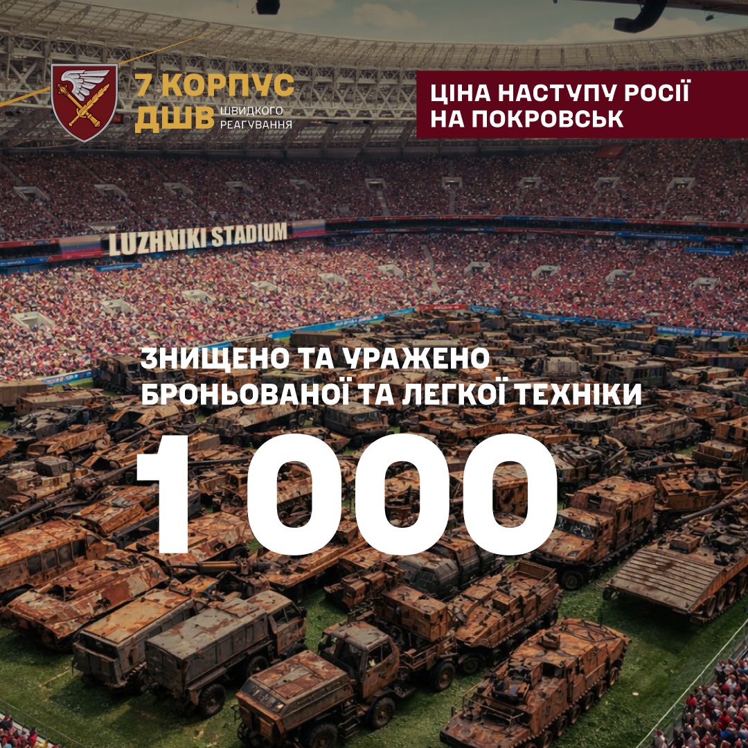 Останки знищеної та підбитої під Покровськом броньованої, автомобільної, квадро та мото техніки у кількості одної тисячі одиниць, могли б поміститися на газоні одного з найбільших у Росіїї стадіонів "Лужнікі".
