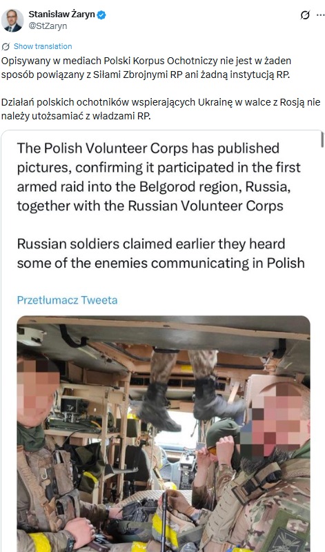 "Описаний у ЗМІ Польський добровольчий корпус жодним чином не пов'язаний з польськими збройними силами або будь-якою польською установою. Діяльність польських добровольців, які підтримують Україну в боротьбі з Росією, не слід ототожнювати з владою Республіки Польща", — писав він.