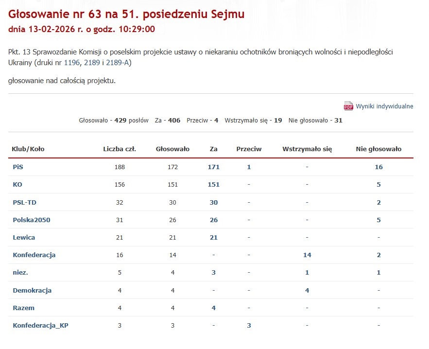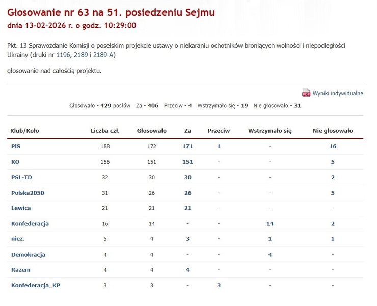 За цей закон проголосували 406 депутатів Сейму. Його підтримали 171 депутат від партії "Право і справедливість", 151 депутат від "Громадянської коаліції", 32 депутати від Польської народної партії, 26 депутатів від партії "Польща 2050", чотири депутати від партії "Розєм" і три незалежні депутати.