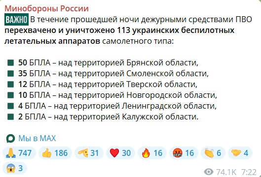 Тим часом Міноборони РФ повідомило, що в ніч на 19 лютого росіян атакували 113 безпілотників, а засоби ППО працювали у шести областях. З переліку регіонів, які потрапили під удар дронів, бачимо, що вони прямували від північного кордону України через Брянськ і Псков на північ і дістались до Ленінградської області. В.о. губернатора Тверської області Віталій Корольов підтвердив наліт БпЛА, при чому перші два пристрої (з 12) знешкодили близько 20:30 (за Києвом).