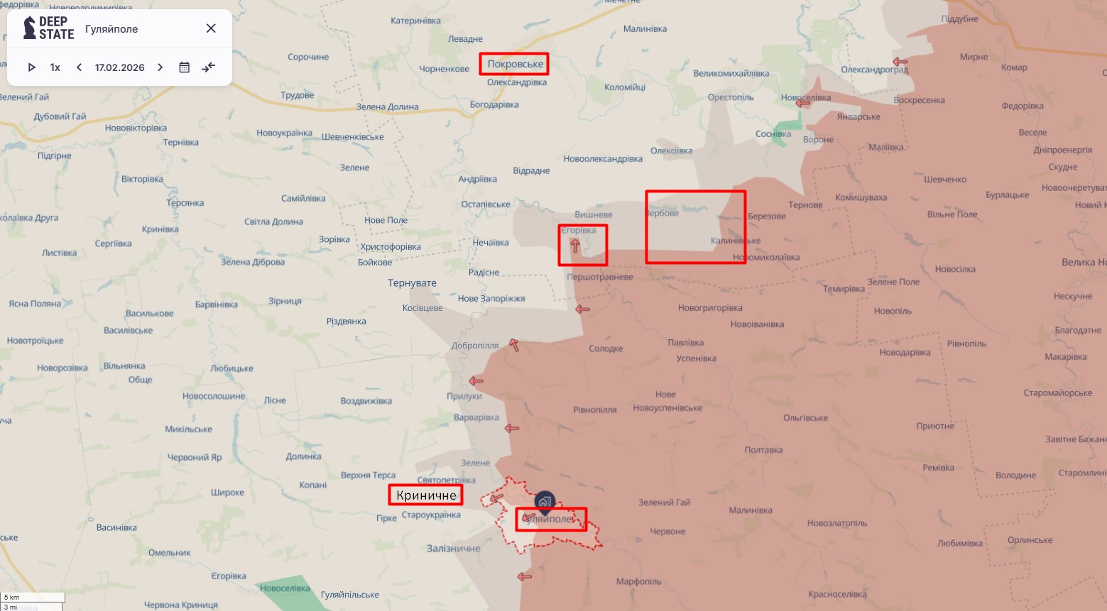 На карті фронту проєкту DeepState останні зміни на Гуляйпільсько-Олександрівському напрямку з'явились 16-17 лютого. Ідеться про відтинок на північний схід від Покровського — населеного пункту на трасі N15, передмістям якого є Олександрівське. Аналітики зменшили червону зону між населеними пунктами Вишневе та Тернове. Орієнтовно, росіян подекуди відкинули на 4,5 км. Південніше — Гуляйполе, яке на половину окуповане, а решта (західна частина) — у сірій зоні. Тим часом село Криничне, згадане Волошиним, розташоване північніше біля сірого клина, який тягнеться до Цвіткового від Святопетрівки.