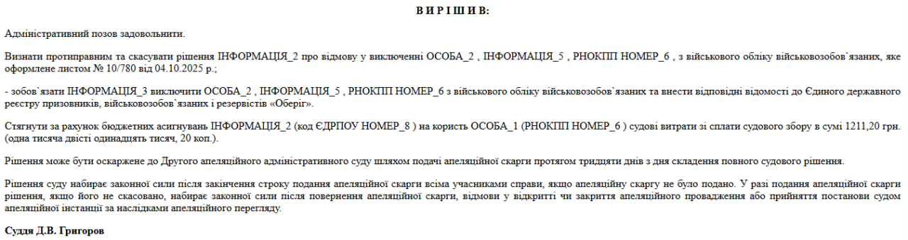 На підставі наданих свідчень суд постановив задовольнити адміністративний позов, визнавши протиправним та скасувавши рішення щодо відмови у знятті з військового обліку. Також суд зобов'язав внести відповідні дані до Єдиного державного реєстру призовників, військовозобов`язаних і резервістів "Оберіг", йдеться у документі.