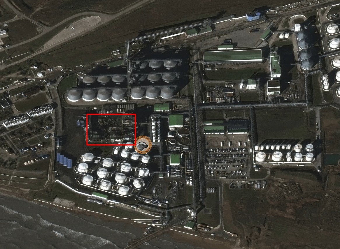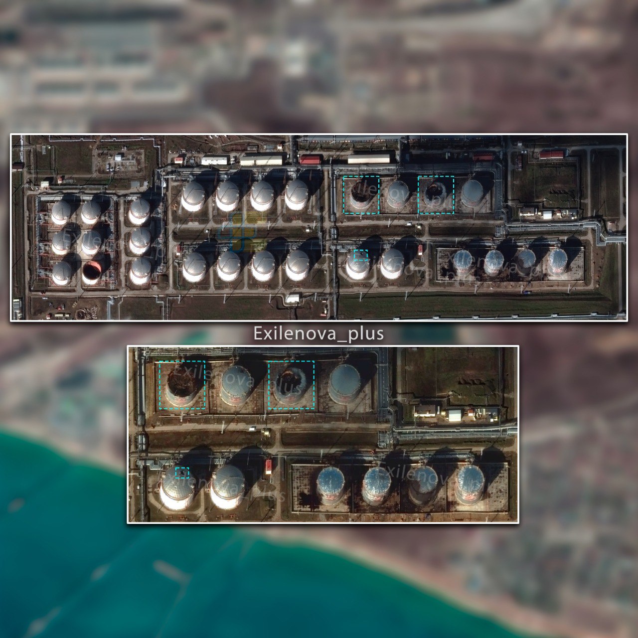 Згідно з даними Exilenova, друга точка влучання — це група нафтових резервуарів "Таманьнефтегаз", розташований північніше цехів. На фото з супутника — група цистерн, почорнілих після удару. При цьому бачимо, що одна цистерна знищена (у другому ряду справа), друга обгоріла (у другому ряду зліва), третя — дещо пошкоджена (у першому ряду зліва).