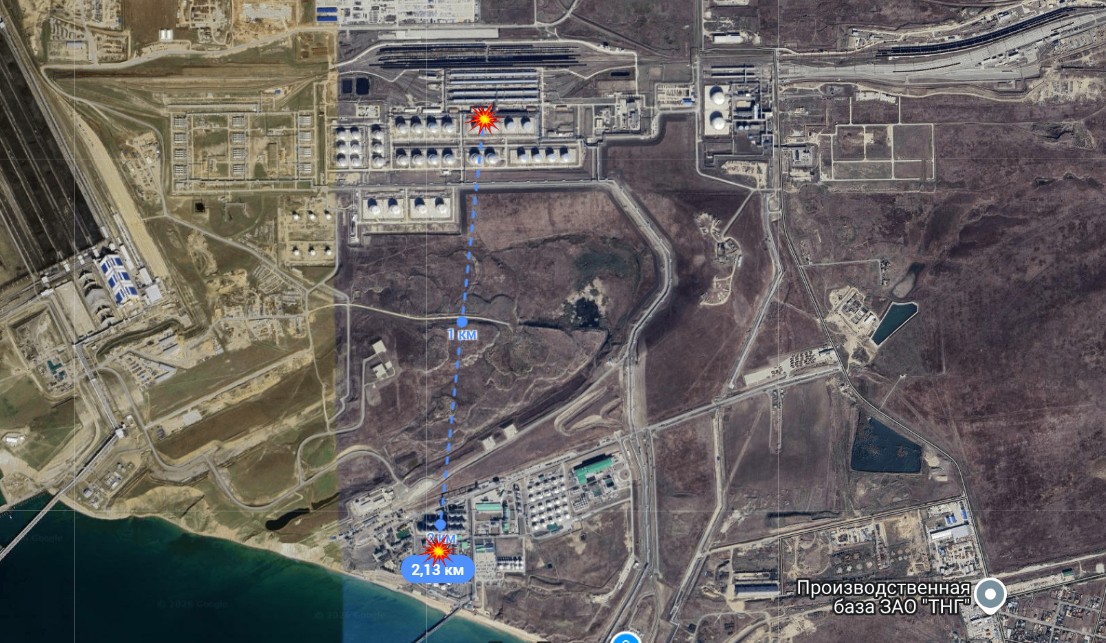Точки на території "Таманьнефтегаз", по яких вдарили дрони СБУ, розташовані на відстані близько 2 км. Крім того, супутникові дані Google maps показують, що ідеться про територію загальною площею близько 2 кв. км, на якій розміщено дві-три групи виробничих приміщень та близько 80 резервуарів різного призначення.