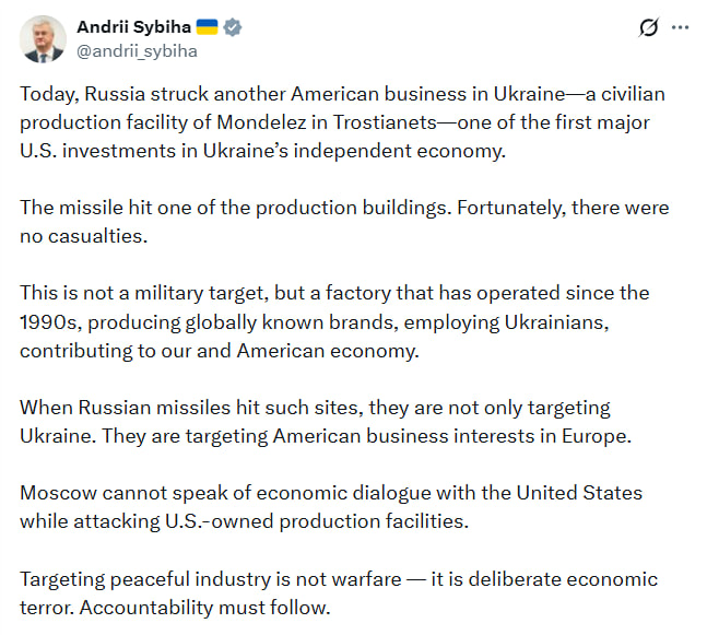 "Сьогодні Росія завдала удару по ще одному американському підприємству в Україні — цивільному виробничому об'єкту Mondelez у Тростянці — одному з перших великих американських інвестиційних проєктів в незалежній економіці України", — зазначив посадовець.