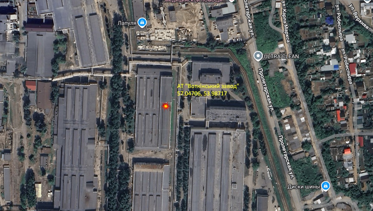 Зауважмо, на Google maps можна відшукати цех, по якому вдарила ракета. Супутникові фото показують, що навколо ураженого приміщення — близько 20 виробничих споруд, а на відстані 500 м — кілька кварталів приватних будинків. Орієнтовна точка удару має координати 57.04706, 53.98717.