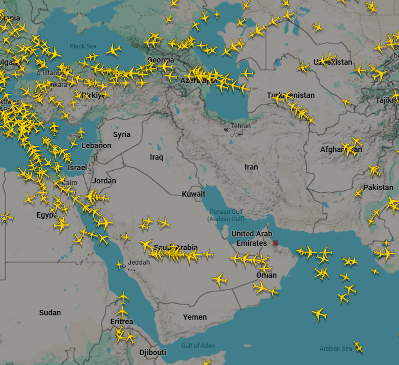19:38. Портал Flightradar24 показує, що над Іраном і низкою сусідніх країн наразі не перебувають судна цивільної авіації. Наразі повітряний простір цих країн є закритим.