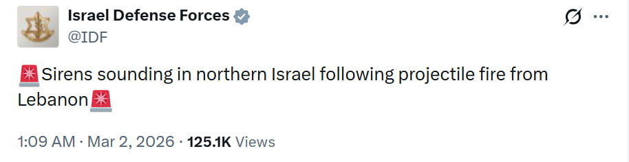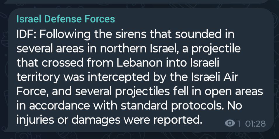 На сторінці Армія оборони Ізраїлю (ЦАХАЛ) близько 01:00 години з'явилося повідомлення, що сирени лунають на півночі Ізраїлю після обстрілу з Лівану.
