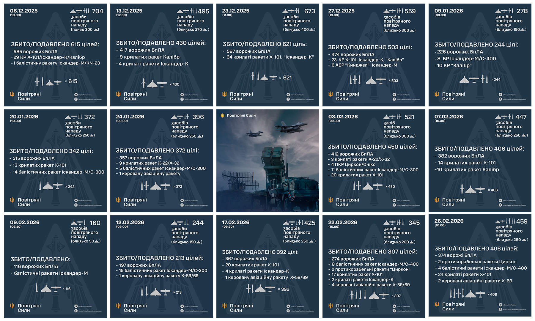 Дані про ракетно-дронові удари РФ з грудня 2025 по лютий 2026 року