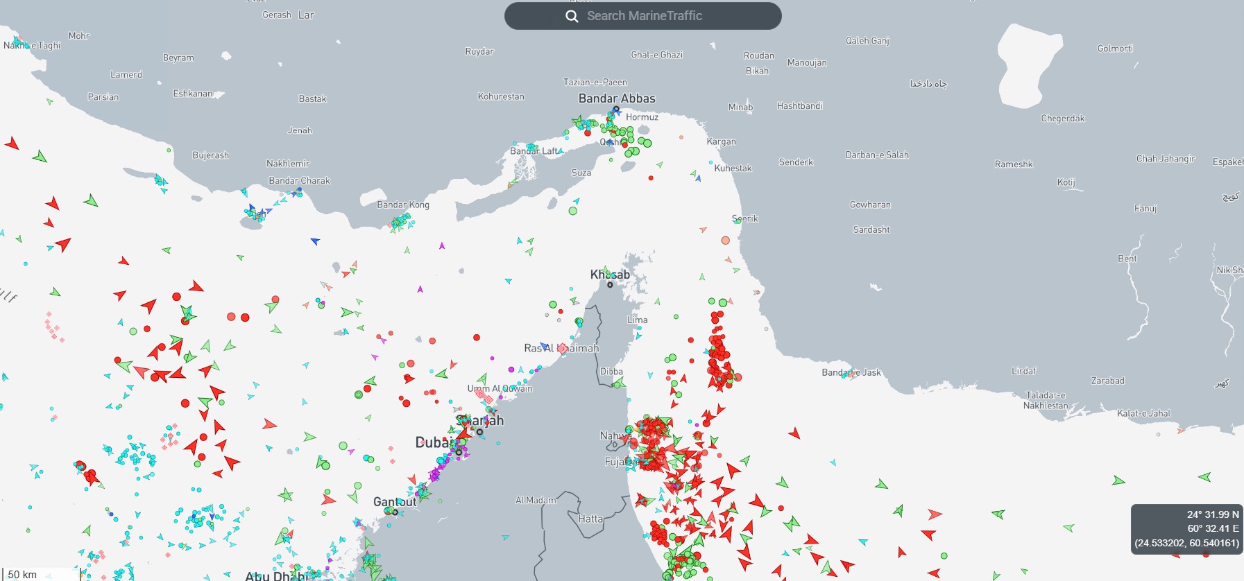 Скриншот даних про трафік через Ормузьку протоку 3 березня, Marinetraffic