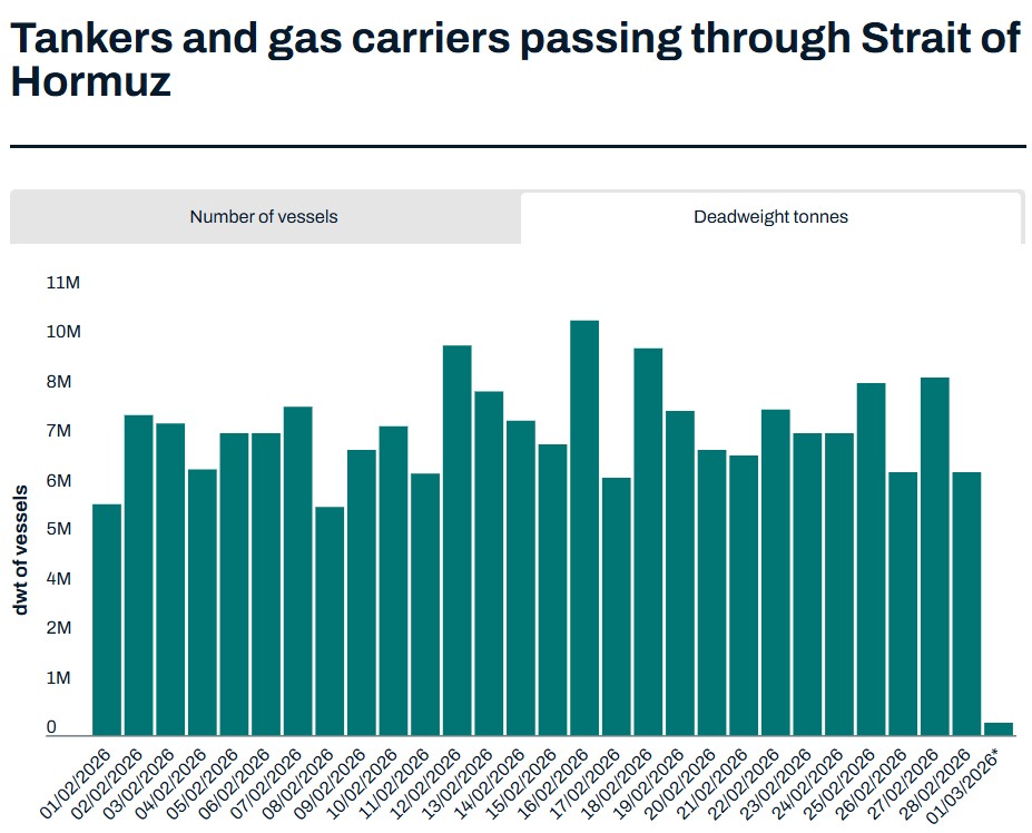 На інформаційному порталі Lloydslist повідомили про зміни трафіку через Ормузьку протоку. 27 лютого, за добу до початку війни в Ірані, нею пройшли 189 корабля, а 28 лютого — вже 72, а 1 березня — лише 17. Бачимо, що трафік упав на 92%. Також зауважили, що з вечора суботи через протоку не пройшло жодне судно. Після того, згідно з даними порталу, були одиничні кораблі й серед них — три судна тіньового флоту РФ. Згодом дані уточнили, наголосивши, що дані про повне блокування, про яке заявив Іран, "перебільшені", але рух скоротився на 80%.