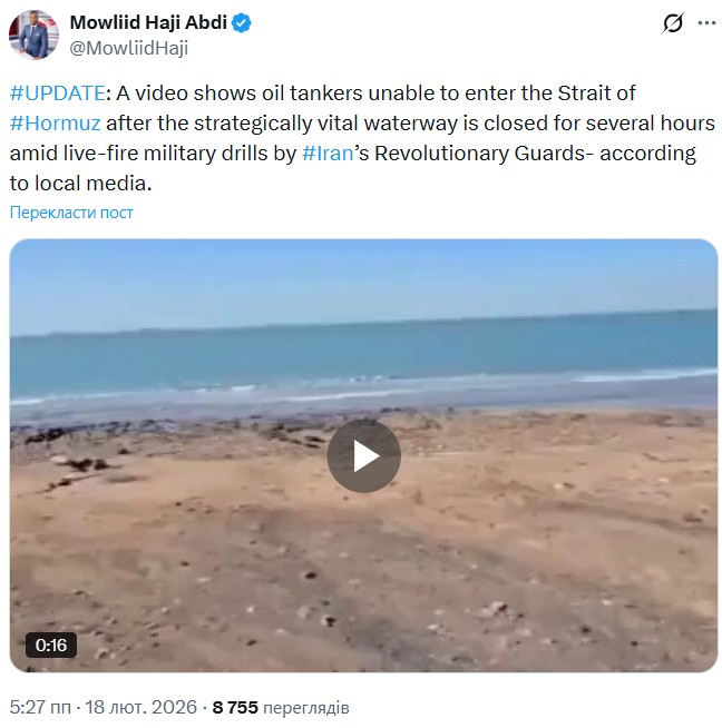 Скриншот допису про Ормузьку протоку за 18 лютого 2026 року
