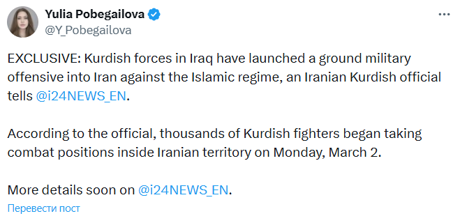 Сама операція почалась ще у понеділок, 2 березня, повідомила старша продюсерка ізраїльського телеканалу i24NEWS Юлія Побегайлова з посиланням на власні джерела в курдських збройних колах.