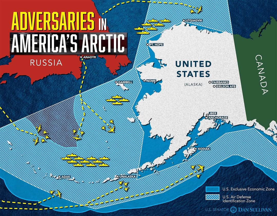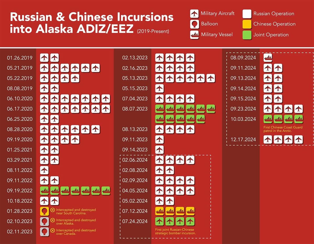 Крім того, Салліван опублікував дані про активність РФ та Китаю у зоні Аляски. Підвищена активність почалась з серпня 2022 року: станом на кінець 22024 року зафіксували майже 100 випадків, коли фіксували літаки, кораблі чи повітряні кулі.