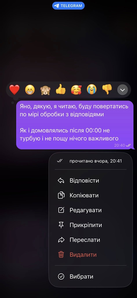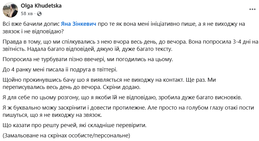 Переписку з Яною Зінкевич Ольга Худецька підтвердила скріншотами, додавши, що зробила з цієї ситуації "дуже багато висновків".