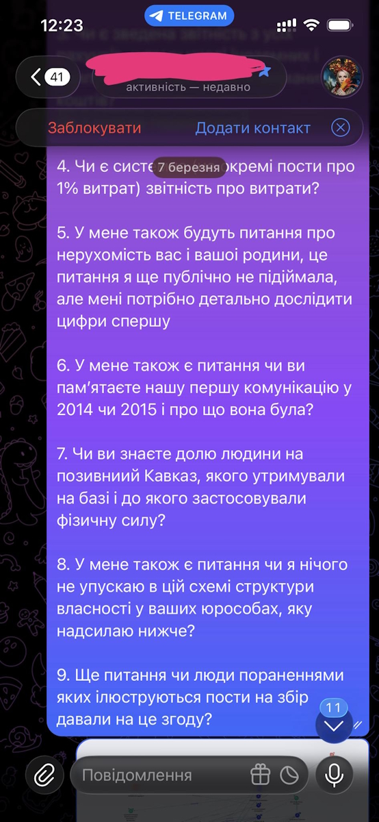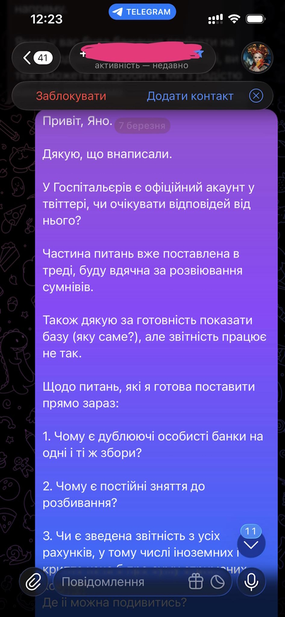 Раніше медійниця, стверджує керівниця "Госпітальєрів", знаходячись на прямому контакті, нібито обрала тактику ігнорування діалогу, хоча й отримала запитання щодо необхідних документів для верифікації звітності.