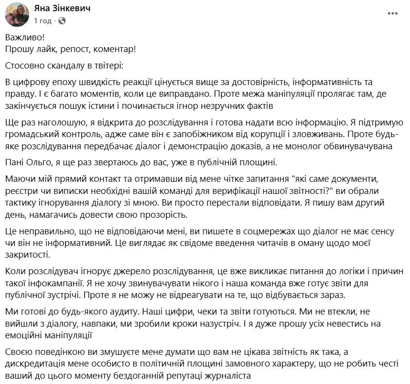 "Ви просто перестали відповідати. Я пишу вам другий день, намагаючись довести свою прозорість", — наголошує Яна Зінкевич.