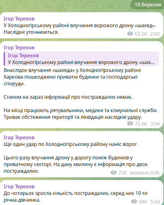 У ніч на 10 березня російські війська двічі вдарили безпілотниками по Холодногірському району Харкова.