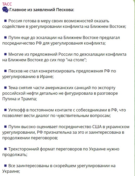 Україна. Брифінг речника Кремля відбувся опівдні 10 березня, через пів доби після контактів Москви та Вашингтона. Пєсков заявив, що Трамп, з одного боку, не торкнувся питання зняття санкцій проти російської нафти, а з іншого, не згадав про перемир'я та припинення вогню в Україні. Крім того, не говорили про продовження переговорів, тому невідомо, коли та де відбудеться нова зустріч, ідеться у дописі росЗМІ. Крім того, з'ясувалось, що Віткофф продовжує контакти з Кремлем по "чутливих питаннях".