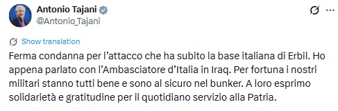 "Я рішуче засуджую напад на італійську базу в Ербілі. Щойно розмовляв з італійським послом в Іраку. На щастя, всі наші солдати в безпеці і здорові в бункері. Висловлюю їм свою солідарність і вдячність за їхню щоденну службу Батьківщині".