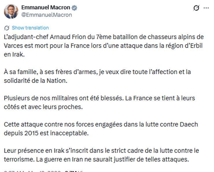 Президент Франції Емманюель Макрон підтвердив загибель старшого прапорщика Арно Фріона з 7-го альпійського батальйону єгерів у Варсі та висловив співчуття родині й товаришам по службі. Він також підкреслив, що влада Франції підтримує поранених та їхніх близьких.