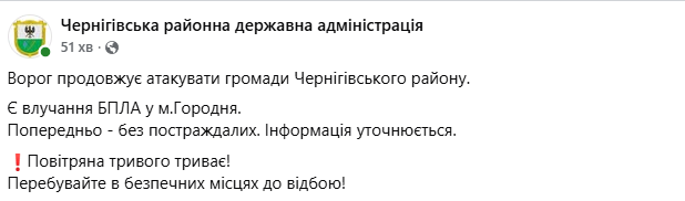За кілька годин "Суспільне Чернігів" повідомило з посиланням на власні джерела в правоохоронних органах і місцевій владі, що об 11:40 зафіксовано влучання російського БпЛА у двоповерхову будівлю, де розміщені працівники окружної прокуратури та РТЦК і СП.