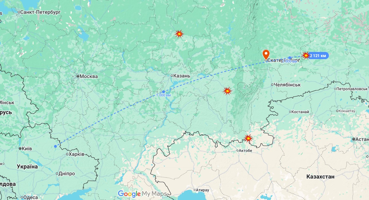 Зазначимо, Фокус писав про удари по РФ, які відбулись за рекордні 1200-1800 км від кордонів України (Уральські гори — за 1500-1600 км, перерізають Росію навпіл і тягнуться на 2 тис. км). Серед інших, атакували НПЗ в Тюмені, за 2100 км, та в Орську, за 1600 км.