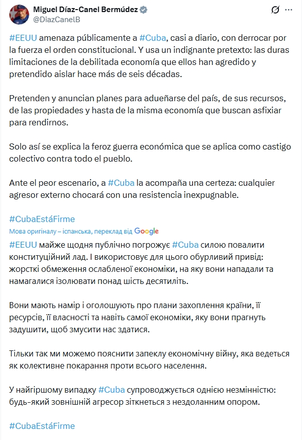 "Зіткнувшись із найгіршим сценарієм, Куба впевнена в одному: будь-який зовнішній агресор зустріне непохитний опір", — написав Діас-Канель у мікроблозі X у вівторок, 17 березня.