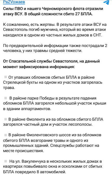Так званий губернатор Севастополя Михайло Развожаєв атаку на окупований Крим підтвердив. За його даними, над регіоном загалом було нібито збито щонайменше 27 безпілотників.