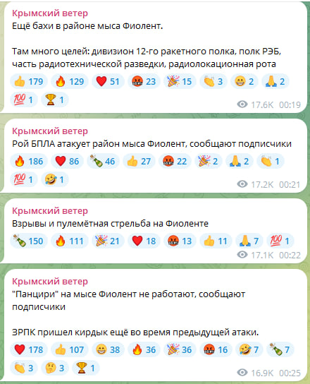 Хоча офіційного підтвердження атаки на об'єкт на момент публікації немає, інший OSINT-канал "Крымский ветер" також пише про наліт безпілотників на окупований Крим. За даними аналітиків, у районі мису Фіолент розміщені багато військових цілей, зокрема дивізіон 12-го ракетного полку, полк РЕБ, частина радіотехнічної розвідки та радіолокаційна рота.