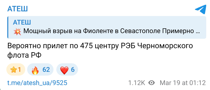 "Потужний вибух на Фіоленті в Севастополі… Ймовірно, "приліт" по 475 центру РЕБ Чорноморського флоту РФ", — йдеться у повідомленні партизанів.