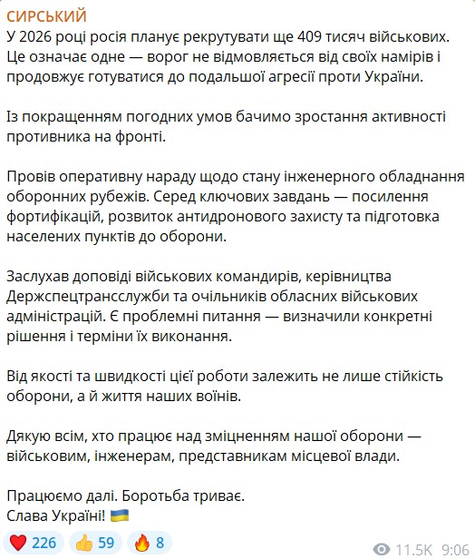 Збільшення чисельності ЗС РФ говорить про те, що Москва не планує зупиняти війну, а готується до нового наступу, ідеться у дописі Сирського у Telegram-каналі. Українське командування готує відповідь. Зі слів головнокомандувача, ідеться про будівництво фортифікацій, розвиток антидронового захисту, підготовки громад до оборони. До всього, Генштаб намагатиметься швидко приймати рішення та стежити з виконанням поставлених завдань.