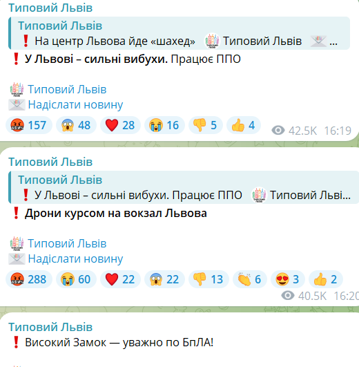 У Львові прогриміли вибухи невдовзі після того, як стало відомо, що в напрямку міста летить ворожий ударний дрон.