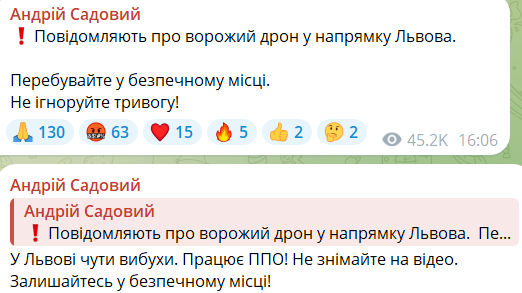 Мер міста Андрій Садовий повідомив про роботу протиповітряної оборони в місті і попросив не знімати нічого на відео, а також залишатися в безпечному місці.
