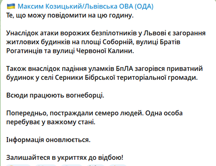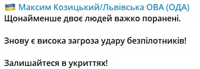 У Львівській обласній військовій адміністрації повідомляють про щонайменше двох тяжкопоранених і просять залишатися в укритті, бо загроза триває.