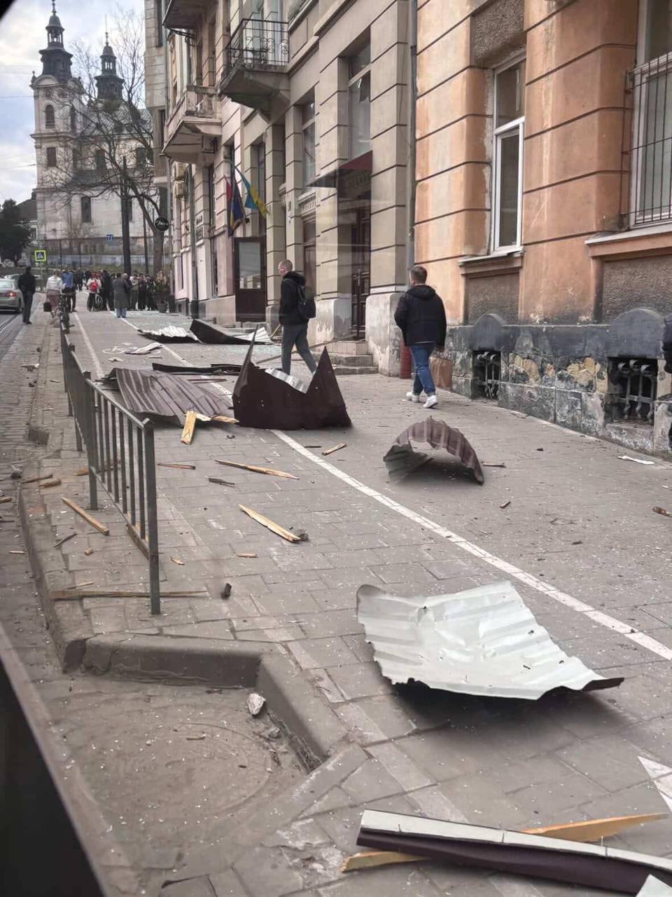Також пошкодження зафіксовано на вулиці Бандери, біля музею "Тюрма на Лонцького", повідомляє Telegram-канал "Львівич". Уламки даху однієї з будівель повилітали на проїжджу та пішохідну частини.