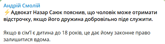 "Але за умови, якщо вона служить саме у Збройних силах України. Не в поліції, не в ДСНС. Ці служби також виконують свої обов'язки під час воєнного стану, але це не є підставою для отримання чоловіком відстрочки", — наголосила юристка.