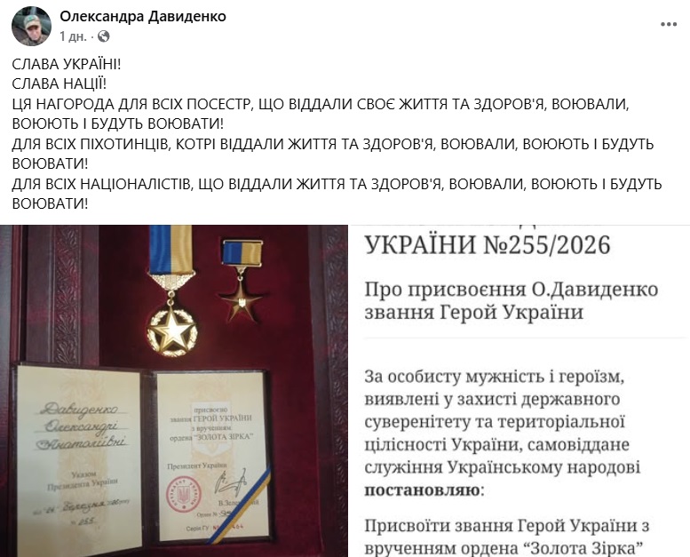 "У січні на Покровському напрямку особисто ліквідувала чотирьох ворожих піхотинців і ще двох поранила, відбиваючи російський наступ. Ворог відступив, але здійснив артилерійський та мінометний обстріл українських позицій. Незважаючи на поранення, Олександра Давиденко евакуювала пораненого побратима з поля бою", — йдеться в публікації.