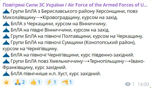 Повітряні сили ЗСУ тим часом проінформували, що частина БпЛА РФ справді зайшла на територію Львівщини та Івано-Франківщини. Крім того, частина "Шахедів" іде через Черкащину у бік Канева та Корсунь-Шевченківського, а свіжа "порція" російських безпілотників перебуває у районі Чернігова-Славутича чи іде у бік Полтави.