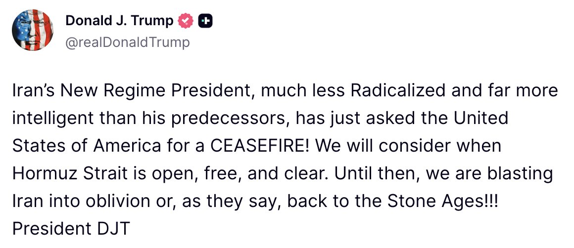 За його словами, США готові розглядати перемир'я лише після того, коли Іран відкриє та почистить Ормузьку протоку.