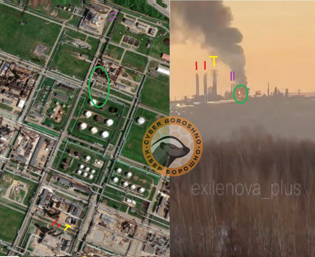 Аналітики зауважили, що АВТ-5 — ключове устаткування на НПЗ "Башнефть-Новойл" в Уфі, без якого підприємство може втратити можливість переробляти російську нафту. За геолокацією відео з активним горінням та хмарами диму вони встановили координати спостерігача та епіцентр пожежі. Бачимо, що дрони вдарили по майданчику на території підприємства, оточеному 20 нафтовими резервуарами: горять не вони, а устаткування НПЗ.