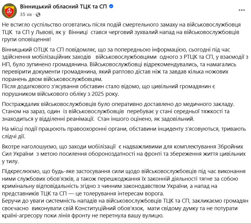 Під час здійснення мобілізаційних заходів військовослужбовцями одного з РТЦК та СП у взаємодії з поліцейськими було зупинено громадянина для перевірки військово-облікових документів. Громадянин, як повідомляє Вінницький ОТЦК та СП, раптово дістав ніж та завдав кілька ножових поранень двом військовослужбовцям. Постраждалих було оперативно доставлено до медичного закладу. Станом на зараз, один із військовослужбовців перебуває у стані середньої тяжкості та знаходиться у відділенні реанімації. Стан іншого оцінено як задовільний.